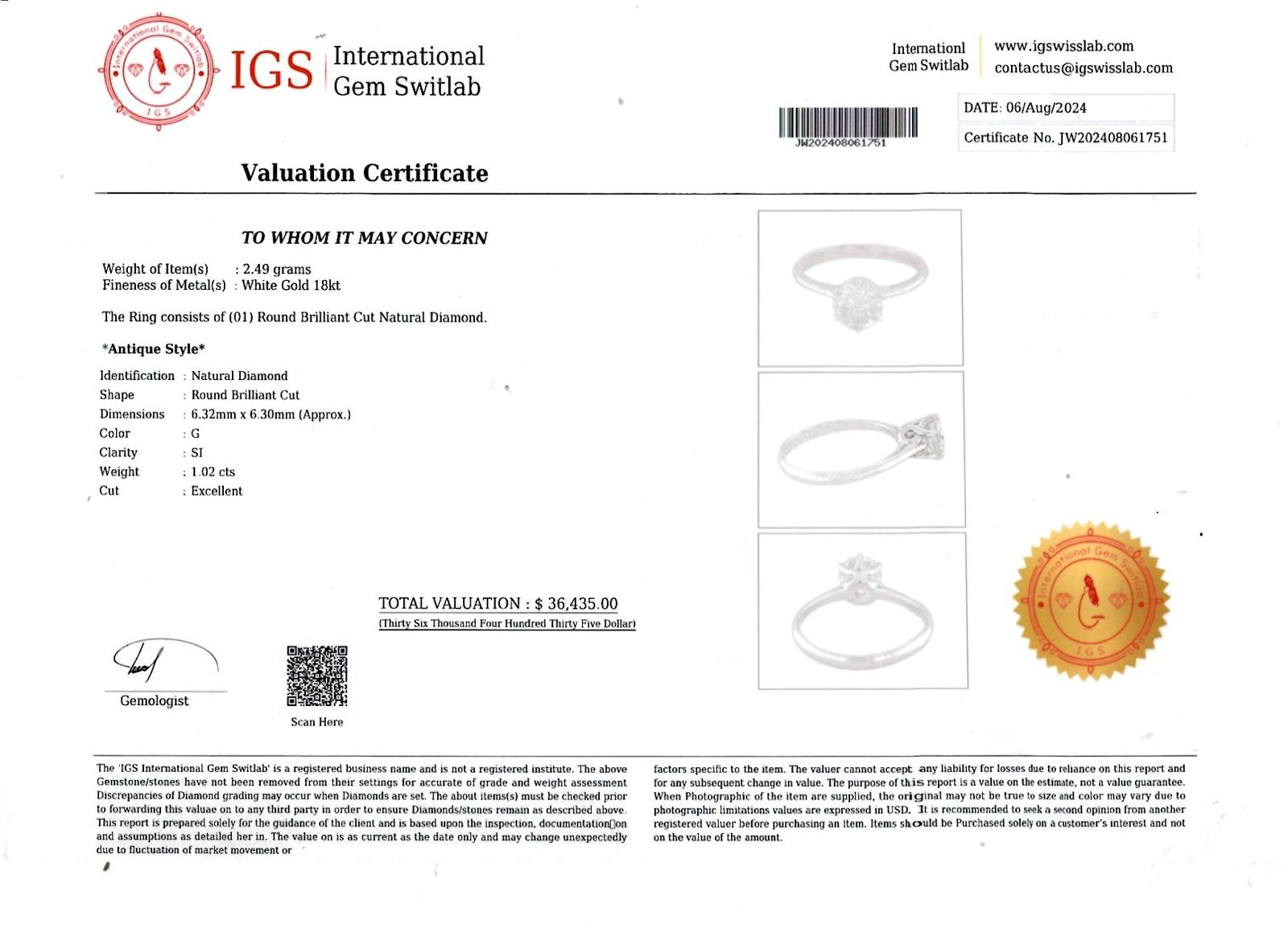 Elevate your style with this exquisite 1.02ct Round Brilliant Cut Natural Diamond Ring, a timeless symbol of elegance and sophistication. Featuring a dazzling round brilliant cut diamond with exceptional sparkle, this piece is designed to captivate and impress.
