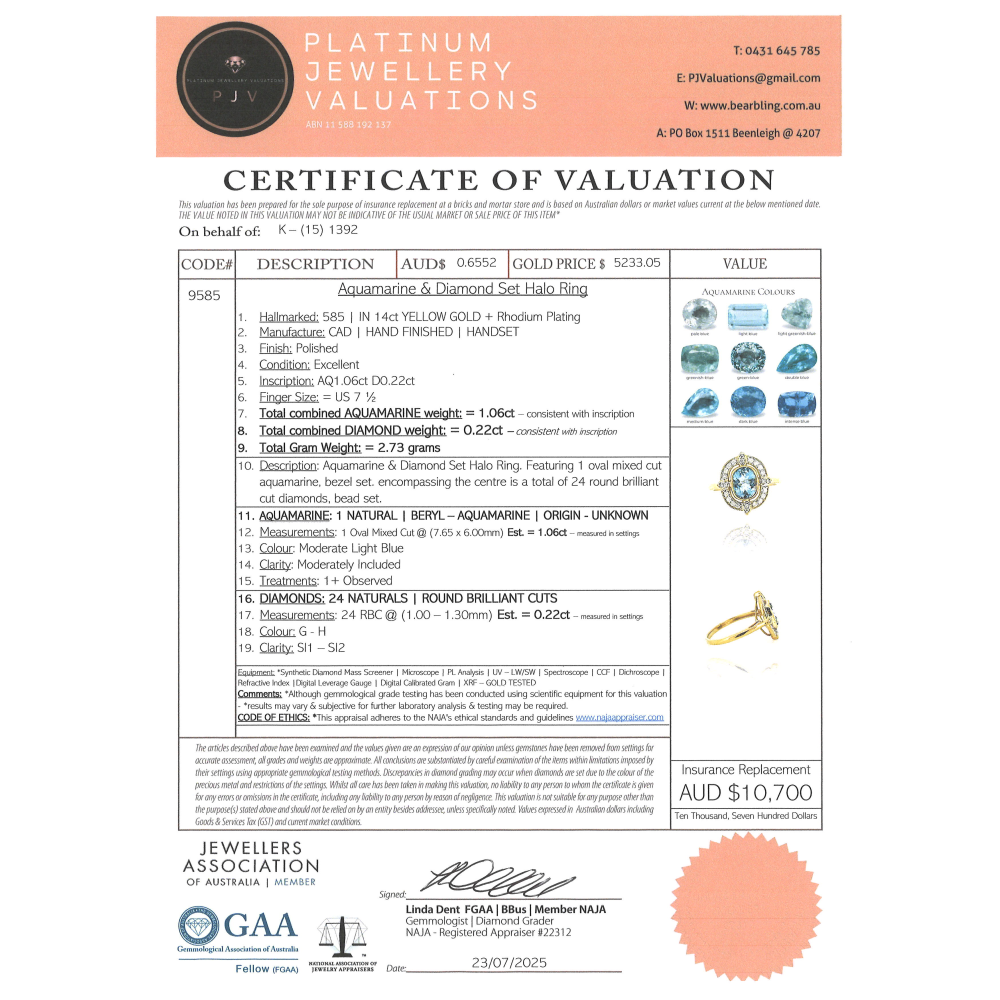The centre of this design features a 1.06ct oval cut Aquamarine (moderate light blue, moderately included, enhanced), bezel set to highlight its serene glow. Surrounding the centre in a refined halo are 24 round brilliant cut Diamonds (0.22ct TDW, G–H colour, SI1–SI2 clarity), bead set in White Gold to create a luminous frame of sparkle.