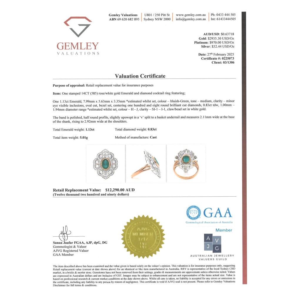 The centre features a 1.13ct oval cut Emerald (bluish-green, minor eye visible inclusions), bezel set in Rose Gold to accentuate its vibrant tone. Embellishing the design are 108 round brilliant cut Diamonds (0.83ct TDW, H–J colour, SI1–I1 clarity), claw/bead set in White Gold to create a striking contrast and ornate brilliance.