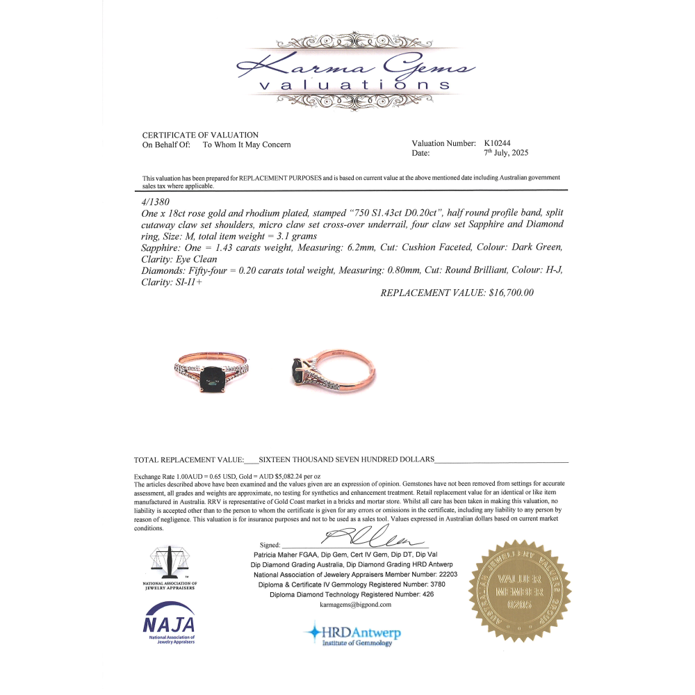 This Insurance Valuation has been provided by a registered Jewellery Valuer and is intended for insurance purposes only. The valuation amount has no bearing on the auction value of the item. Any questions regarding the valuation should be directed to the issuing Valuer (refer to contact details on the certificate) as Luxe Auctions have no association or relationship with the Valuer, or the valuation amount contained within the valuation.
