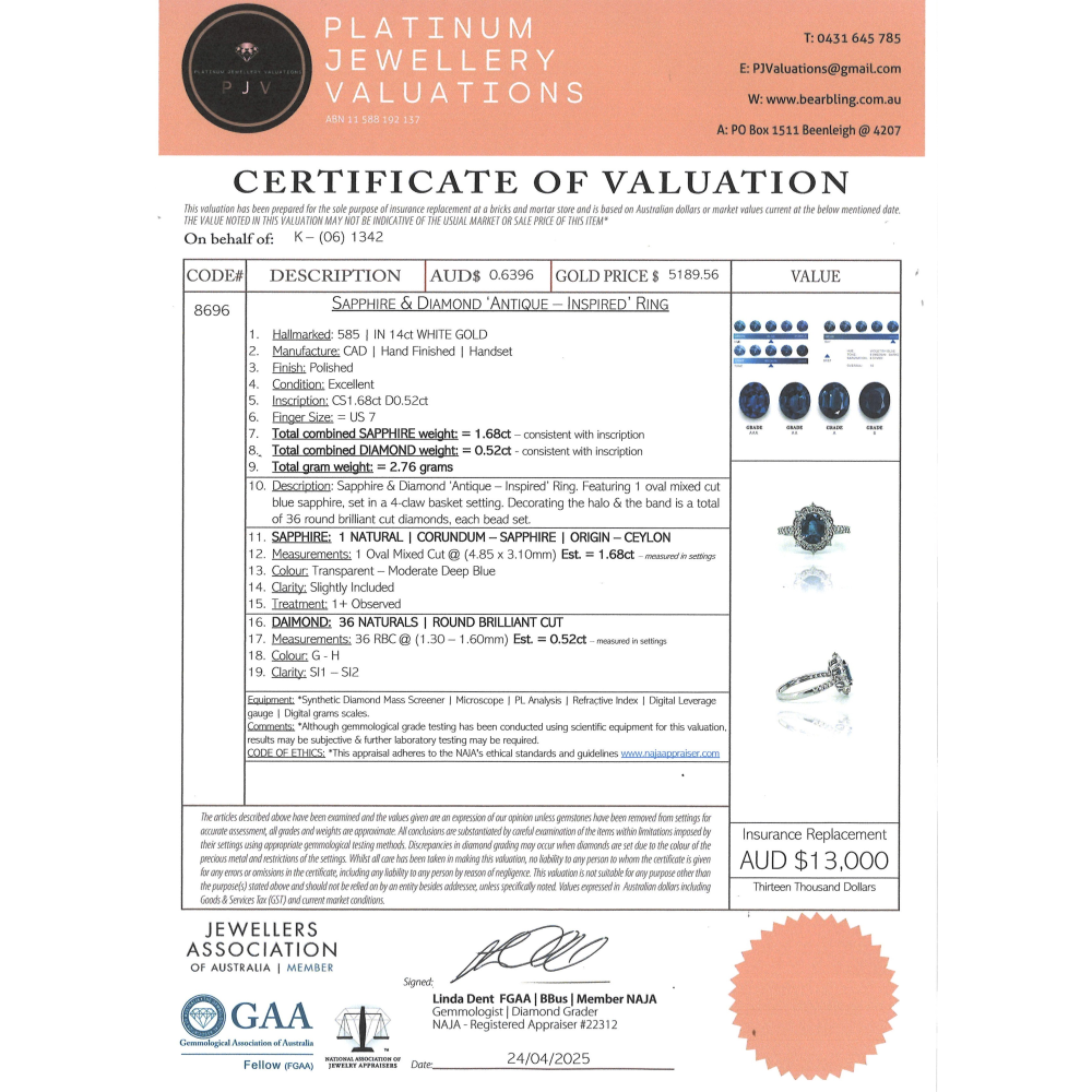 The centre of this elegant design features a 1.68ct oval cut Ceylon Sapphire (deep blue, slightly included), securely claw set to highlight its rich colour and allure. Decorating both the halo and the band are 36 round brilliant cut Diamonds (0.52ct TDW, G–H colour, SI1–SI2 clarity), bead set to add radiant brilliance and refined detail.