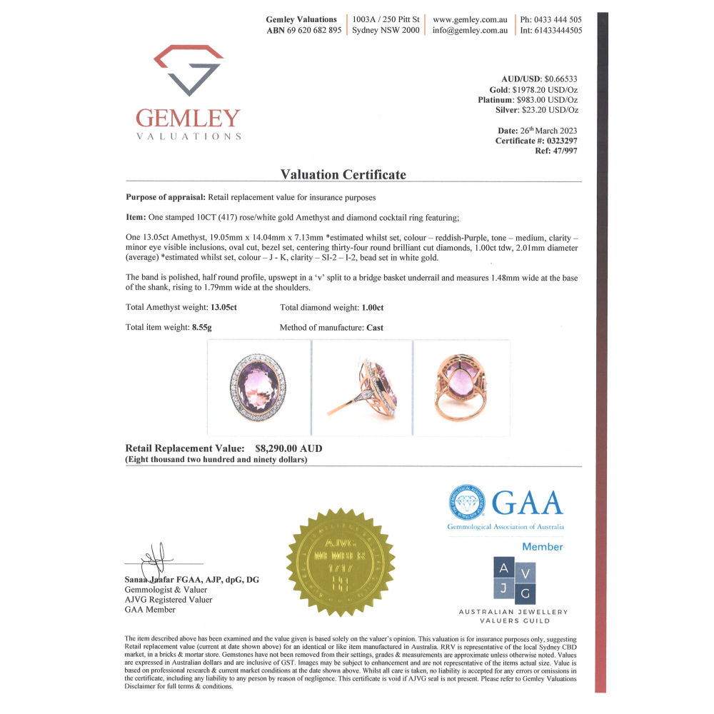 This Insurance Valuation has been provided by a registered Jewellery Valuer and is intended for insurance purposes only. The valuation amount has no bearing on the auction value of the item. Any questions regarding the valuation should be directed to the issuing Valuer (refer to contact details on the certificate) as Luxe Auctions have no association or relationship with the Valuer, or the valuation amount contained within the valuation.