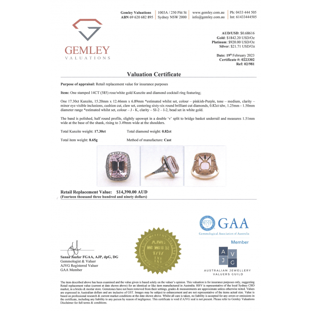 Centre Gemstone: Cushion cut Kunzite (17.30ct, pinkish-purple, very minor eye visible inclusions), 4 claw set