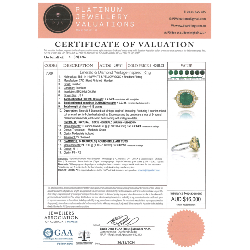The centre features a 2.04ct fancy cushion cut Emerald (moderately included clarity), claw set in Yellow Gold to showcase its rich green tone. Encompassing the centre are 24 round brilliant cut Diamonds (0.27ct TDW, H–I colour, P1–P2 clarity), bead set in Yellow Gold with millegrain detail to add refined sparkle and vintage character.
