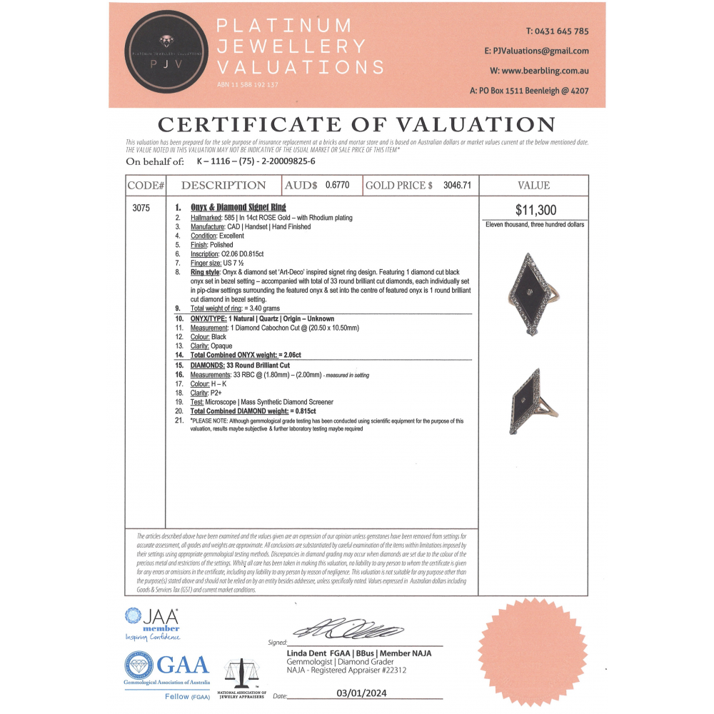 This Art Deco inspired design showcases a striking 2.06ct cabochon cut black Onyx (opaque), bezel set at the centre for a sleek and dramatic finish. Enhancing the design, 33 round brilliant cut Diamonds (0.815ct TDW, H–K colour, P2+ clarity) are meticulously pip-claw/bezel set, adding refined brilliance and timeless detail.