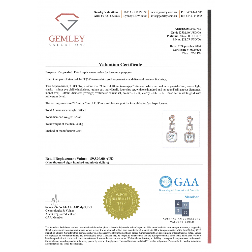 This Insurance Valuation has been provided by a registered Jewellery Valuer and is intended for insurance purposes only. The valuation amount has no bearing on the auction value of the item. Any questions regarding the valuation should be directed to the issuing Valuer (refer to contact details on the certificate) as Luxe Auctions have no association or relationship with the Valuer, or the valuation amount contained within the valuation.