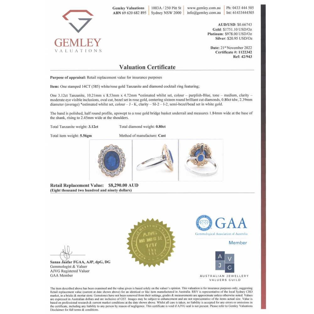 The design highlights a 3.12ct oval cut Tanzanite (purplish-blue, moderate eye visible inclusions), securely bezel set in warm Rose Gold. Framing the centre in a scalloped halo design are 16 round brilliant cut Diamonds (0.80ct TDW, J–K colour, SI2–I2 clarity), semi-bezel/bead set to enhance light reflection and detail.