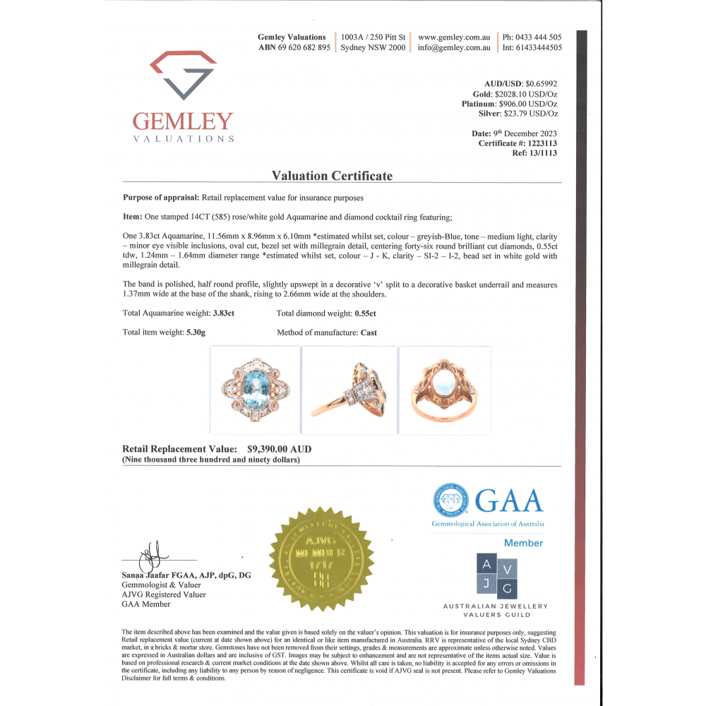 3.83ct TSW Rose Gold Aquamarine and Diamond Cocktail Ring