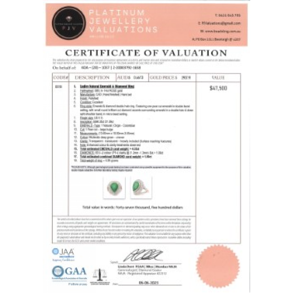 - Centre Stone: Pear-cut moderate deep green Colombian Emerald (4.35ct, heavily included, enhanced), double bezel set