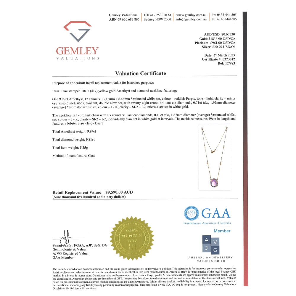 This Insurance Valuation has been provided by a registered Jewellery Valuer and is intended for insurance purposes only. The valuation amount has no bearing on the auction value of the item. Any questions regarding the valuation should be directed to the issuing Valuer (refer to contact details on the certificate) as Luxe Auctions have no association or relationship with the Valuer, or the valuation amount contained within the valuation.