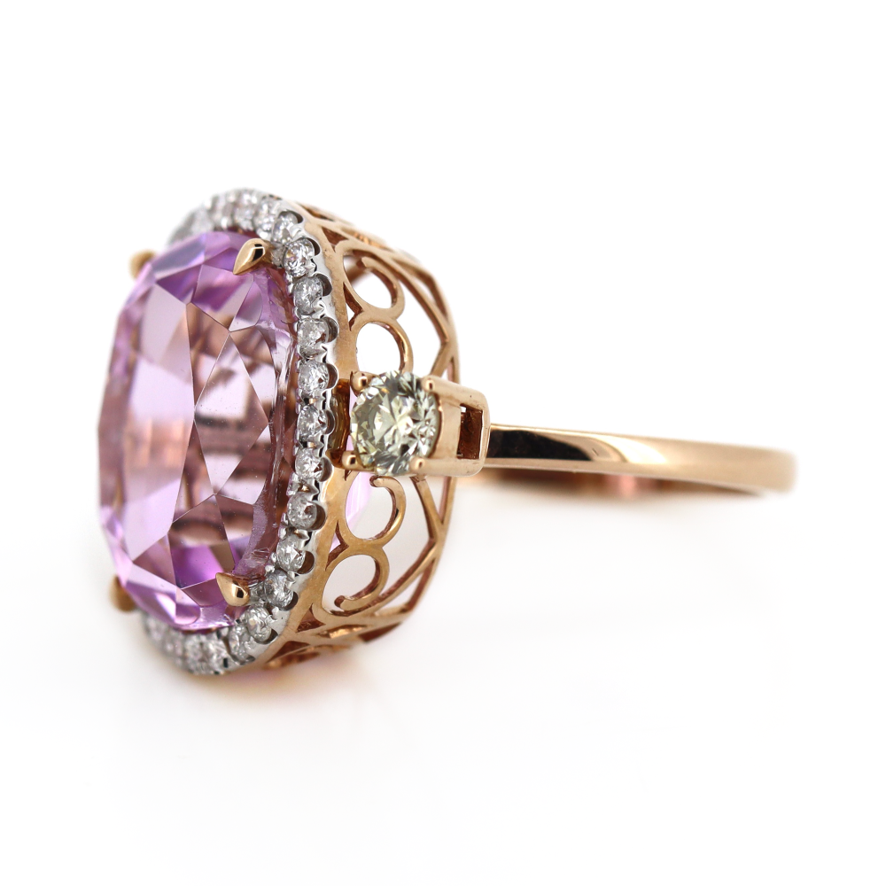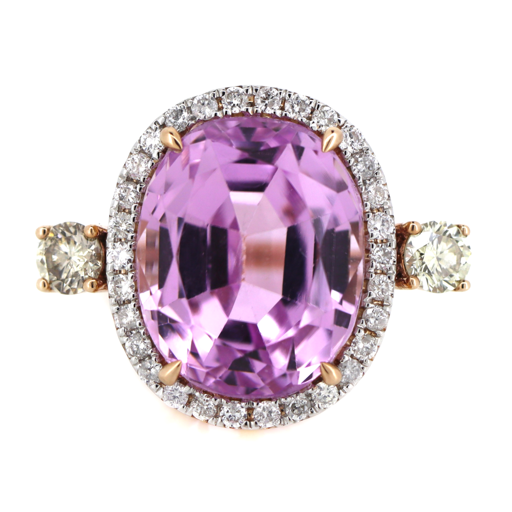 The centre features one oval faceted cut medium deep purplish-pink Kunzite (16.65ct, eye clean clarity), 4 claw set for opulent dimension. Surrounding the centre are 30 round brilliant cut Diamonds (0.50ct TDW, I-K colour, SI2-P2 clarity), claw set in a halo. Decorating the shoulders are 2 round brilliant cut champagne Diamonds (0.60ct TDW, SI2-P2 clarity), 4 claw set for warmth and elegance.