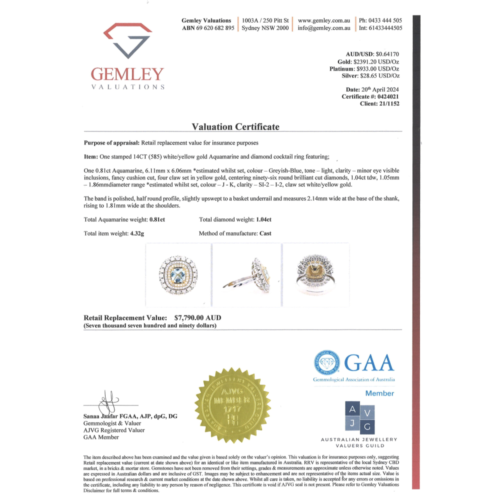 This Insurance Valuation has been provided by a registered Jewellery Valuer and is intended for insurance purposes only. The valuation amount has no bearing on the auction value of the item. Any questions regarding the valuation should be directed to the issuing Valuer (refer to contact details on the certificate) as Luxe Auctions have no association or relationship with the Valuer, or the valuation amount contained within the valuation.