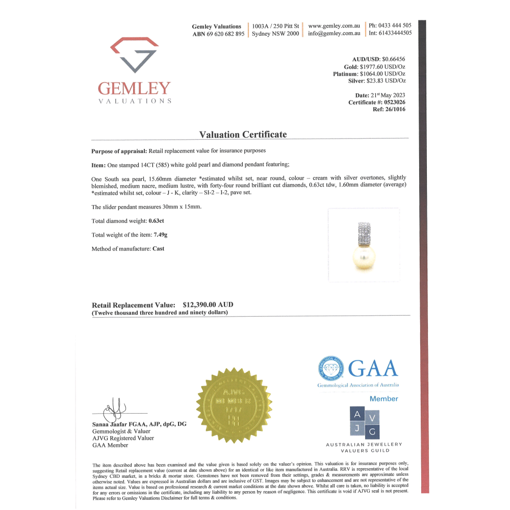 This Insurance Valuation has been provided by a registered Jewellery Valuer and is intended for insurance purposes only. The valuation amount has no bearing on the auction value of the item. Any questions regarding the valuation should be directed to the issuing Valuer (refer to contact details on the certificate) as Luxe Auctions have no association or relationship with the Valuer, or the valuation amount contained within the valuation.