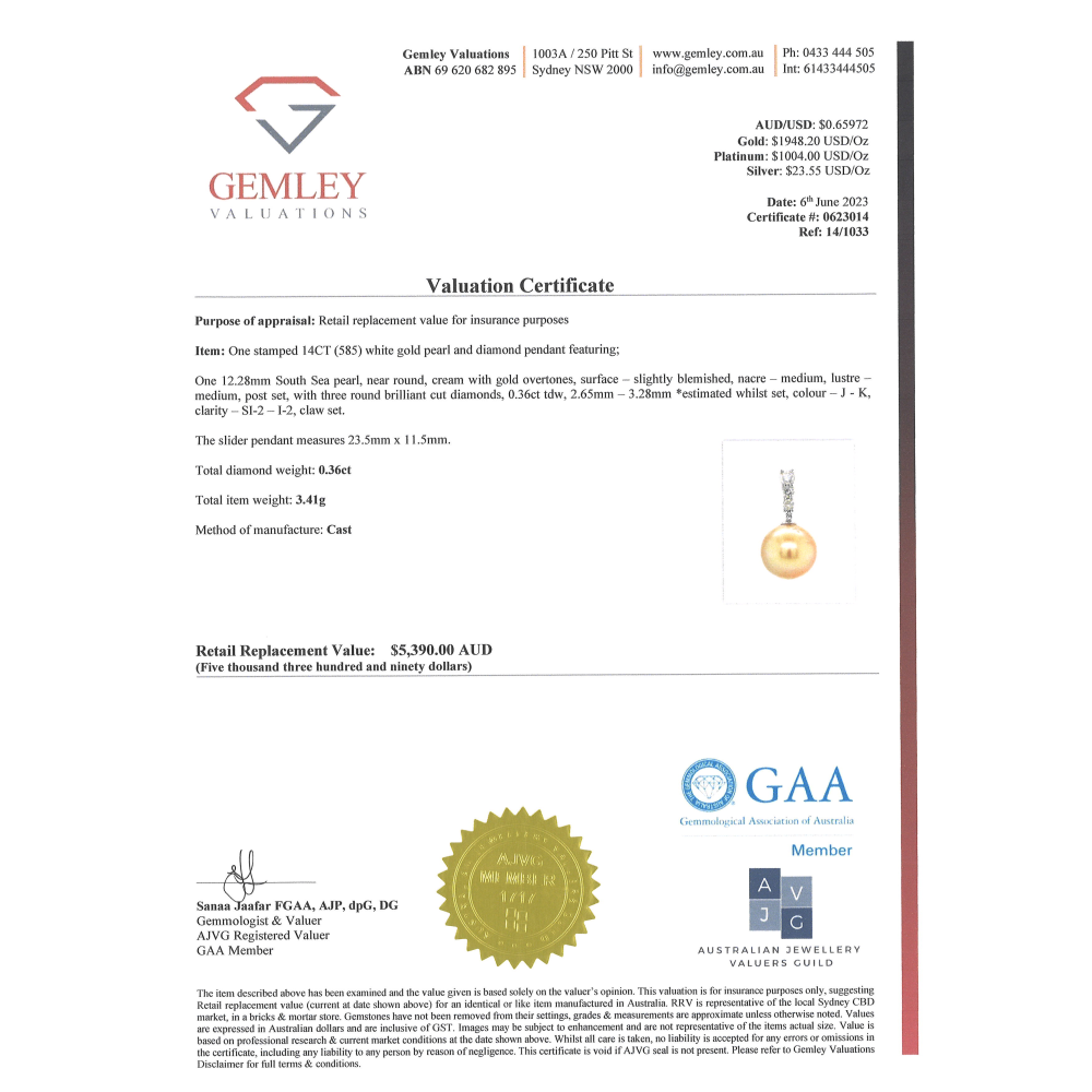 The design showcases a 12.28mm near round Cultured South Sea Pearl, cream in tone with golden overtones, medium lustre and a slightly blemished surface, set as the lower drop. Embellishing the bail are 3 round brilliant cut Diamonds (0.36ct TDW, J–K colour, SI2–I2 clarity), claw set in White Gold for refined sparkle.
