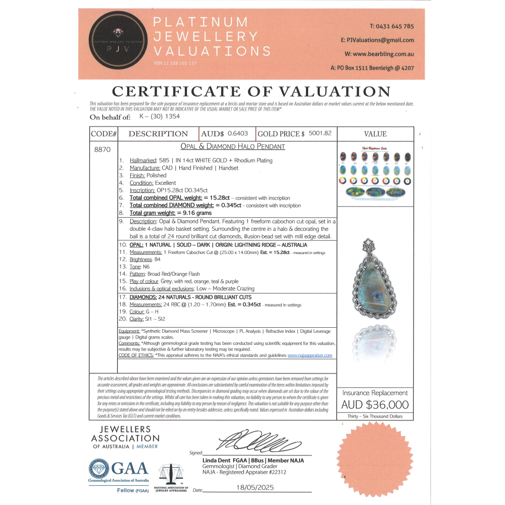 The centre features a freeform cabochon cut Lightning Ridge Opal (15.28ct, flashes of grey with red, orange and teal), double claw set to capture its natural brilliance and vivid play-of-colour. Surrounding the centre in a halo and decorating the bail are 24 round brilliant cut Diamonds (0.345ct TDW, G–H colour, SI1–SI2 clarity), micro-bead set with millegrain details, enhancing the pendant’s opulent charm.