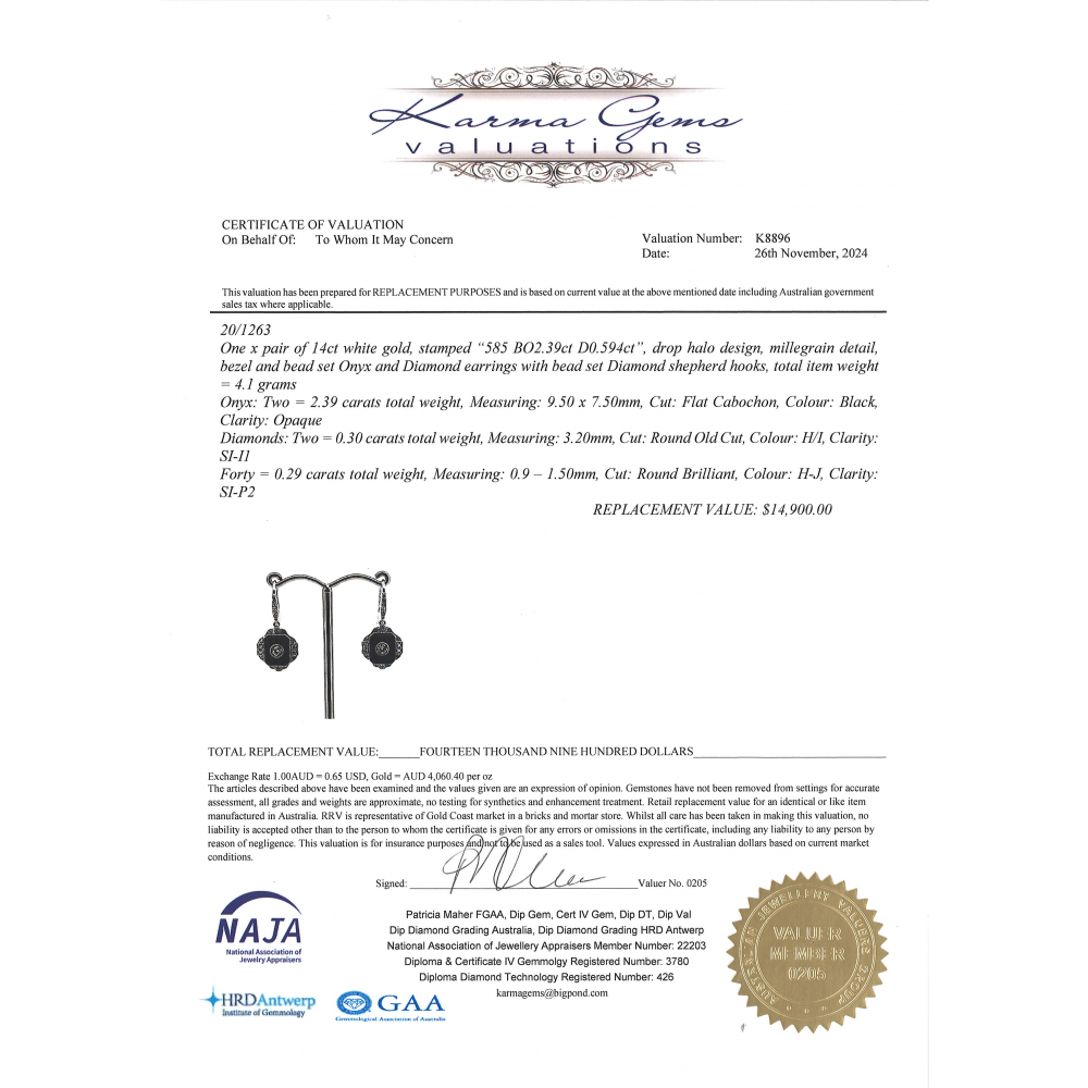 The centres feature 2 flat cabochon cut black Onyx (2.39ct TSW, opaque), bezel set. Centering the Onyx and decorating the drops are 40 round brilliant cut Diamonds (0.29ct TDW, H-J colour, SI-P2 clarity) and 2 round old cut Diamonds (0.30ct TDW, H-J colour, SI-I1 clarity), bead set for vintage shimmer.