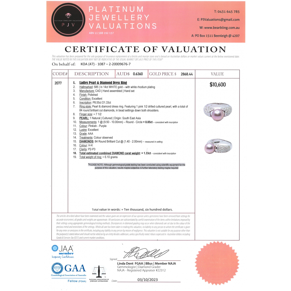 The design features one round pinkish-purple Cultured South Sea Pearl (10mm, slight blemishes, excellent lustre, enhanced), set as the centrepiece. Embellishing the design are 84 round brilliant cut Diamonds (1.33ct TDW, H-K colour, P2-P3 clarity), pavé set for radiant contrast.