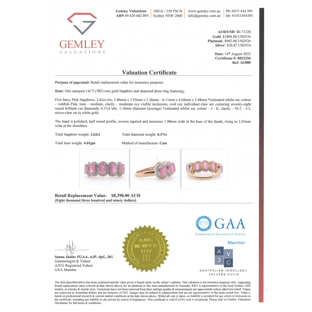 This Insurance Valuation has been provided by a registered Jewellery Valuer and is intended for insurance purposes only. The valuation amount has no bearing on the auction value of the item. Any questions regarding the valuation should be directed to the issuing Valuer (refer to contact details on the certificate) as Luxe Auctions have no association or relationship with the Valuer, or the valuation amount contained within the valuation.
