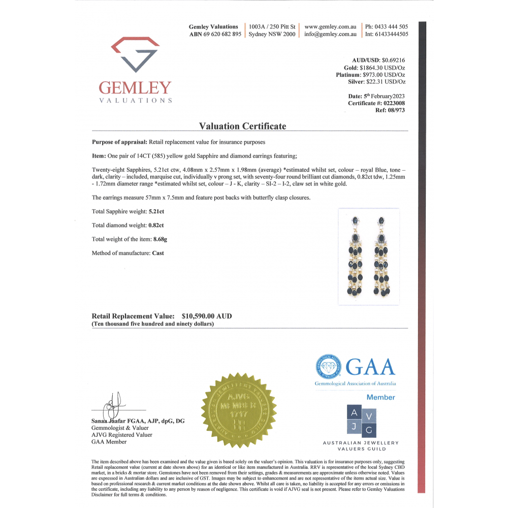These stunning chandelier earrings feature 28 marquise cut Sapphires (5.21ct TSW, royal blue, included), beautifully v-prong set to showcase their rich colour. Enhancing the design are 74 round brilliant cut Diamonds (0.82ct TDW, J–K colour, SI2–I2 clarity), claw set in White Gold to add radiant sparkle and refined contrast.