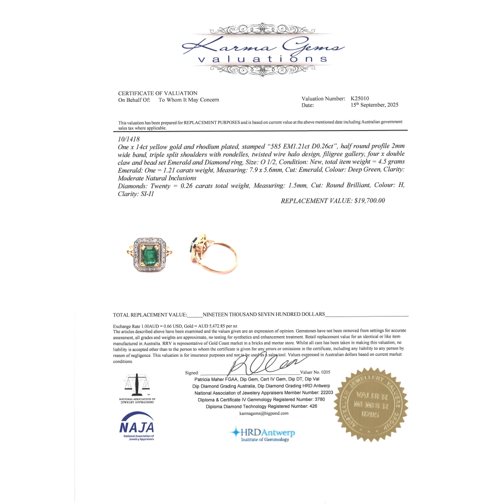 The centre features one emerald cut Emerald (1.21ct, moderate natural inclusions), double four claw set with a millegrain detail halo. Surrounding the centre in a halo are 20 round brilliant cut Diamonds (0.26ct TDW, G-H colour, SI-I1 clarity), bead set in White Gold.