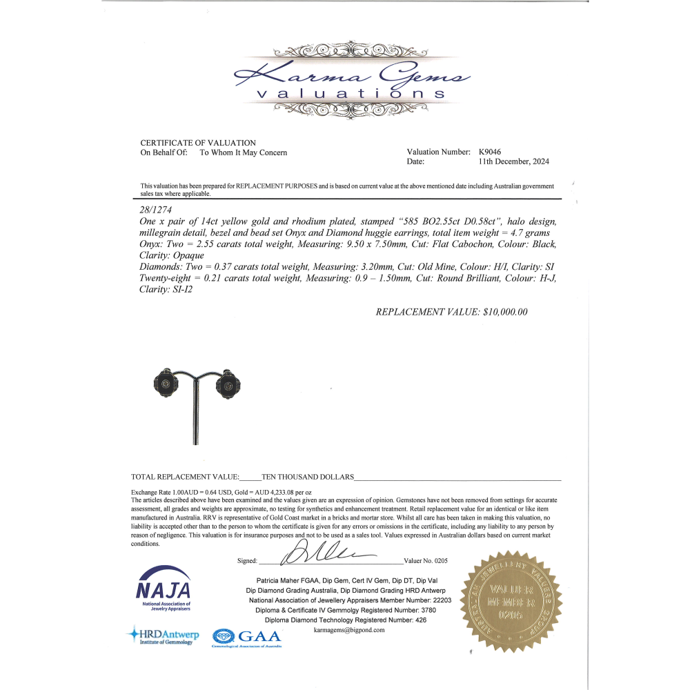 The centre features old cut Diamonds (0.30ct TDW, H–I colour, SI clarity), bezel set. Surrounded by 2 flat cabochon cut black Onyx (2.41ct TSW, opaque), bezel set. Bordering the design are 28 round brilliant cut Diamonds (0.21ct TDW, H–J colour, SI–I2 clarity), bead set with millegrain detail. The earrings feature huggie closures.