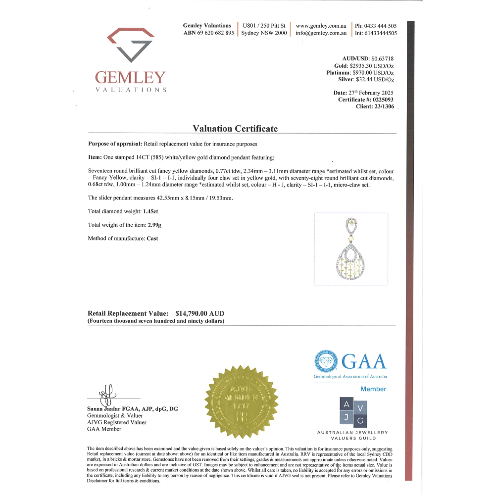 This exquisite pendant showcases 17 round brilliant cut fancy yellow Diamonds (0.77ct TDW, SI1–I1 clarity), 4-claw set in rich Yellow Gold for striking vibrance. Enhancing the design are 78 round brilliant cut Diamonds (0.68ct TDW, H–J colour, SI1–I1 clarity), micro-claw set to add brilliance and refined elegance.