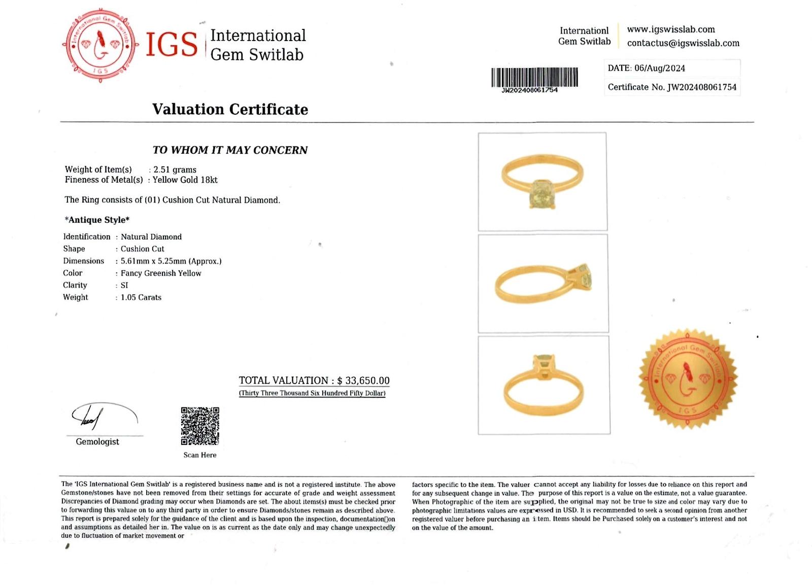 Discover refined elegance with this stunning 1.05ct Fancy Greenish Yellow Cushion-Cut Natural Diamond Ring, a piece that radiates unique charm and sophistication. The fancy greenish-yellow diamond, with its vivid hue and exquisite cushion cut, captures attention with its rare beauty and brilliance.