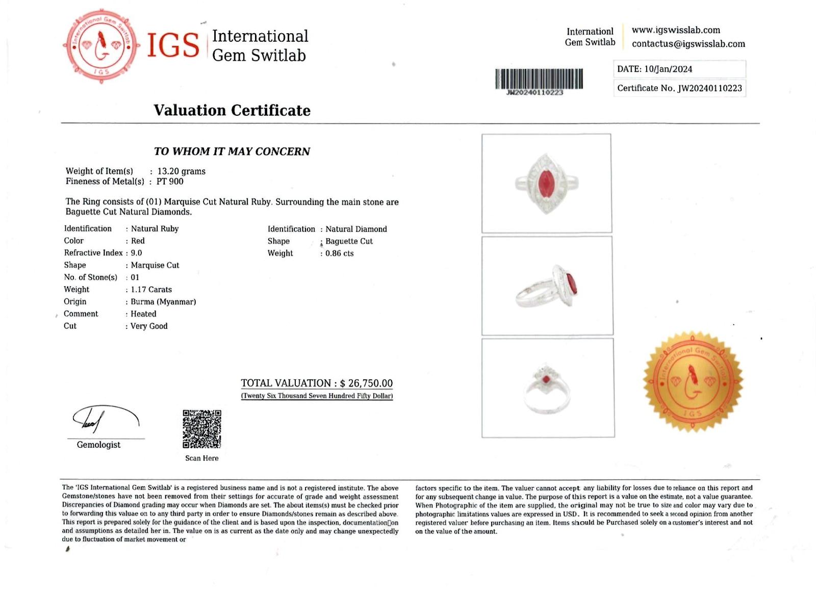 Elevate your jewelry collection with this exquisite 1.17ct Marquise Cut Natural Ruby Ring, a timeless symbol of passion and elegance. The captivating marquise-cut ruby takes center stage, boasting a rich, vibrant hue that reflects its natural origin.