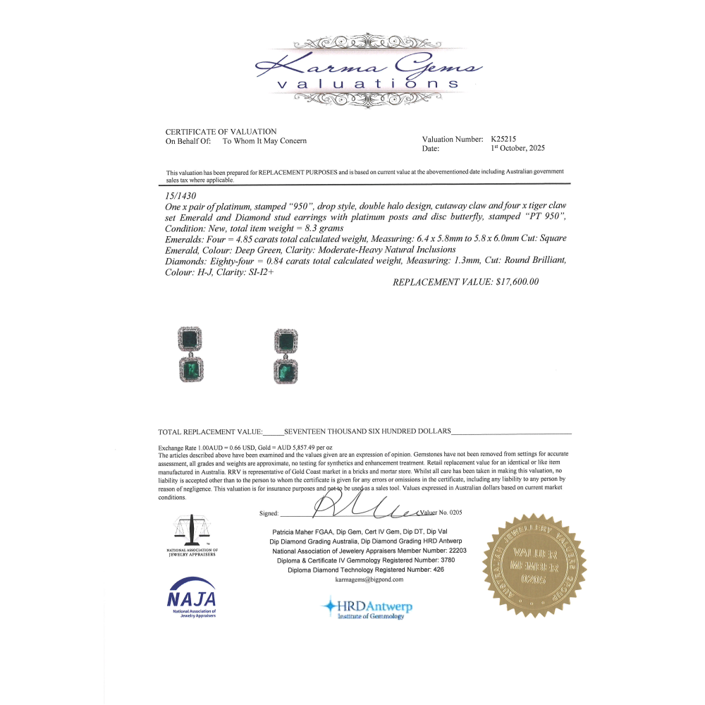 These luxurious halo drop earrings feature richly coloured Emeralds set in premium Platinum, paired with bright diamond halos for an elevated and timeless aesthetic. The design showcases four square emerald cut deep-green Emeralds (4.85ct TSW, moderate–heavy natural inclusions) secured in elegant 4-claw settings, allowing the gemstones’ saturated colour and natural internal character to shine. Surrounding the Emeralds in refined halos are 84 round brilliant cut Diamonds (0.84ct TDW, H–J colour, SI–I2+ clarity) micro-bead set for crisp, even brilliance. The earrings are completed with secure post backs and butterfly clasps for comfortable, confident wear.