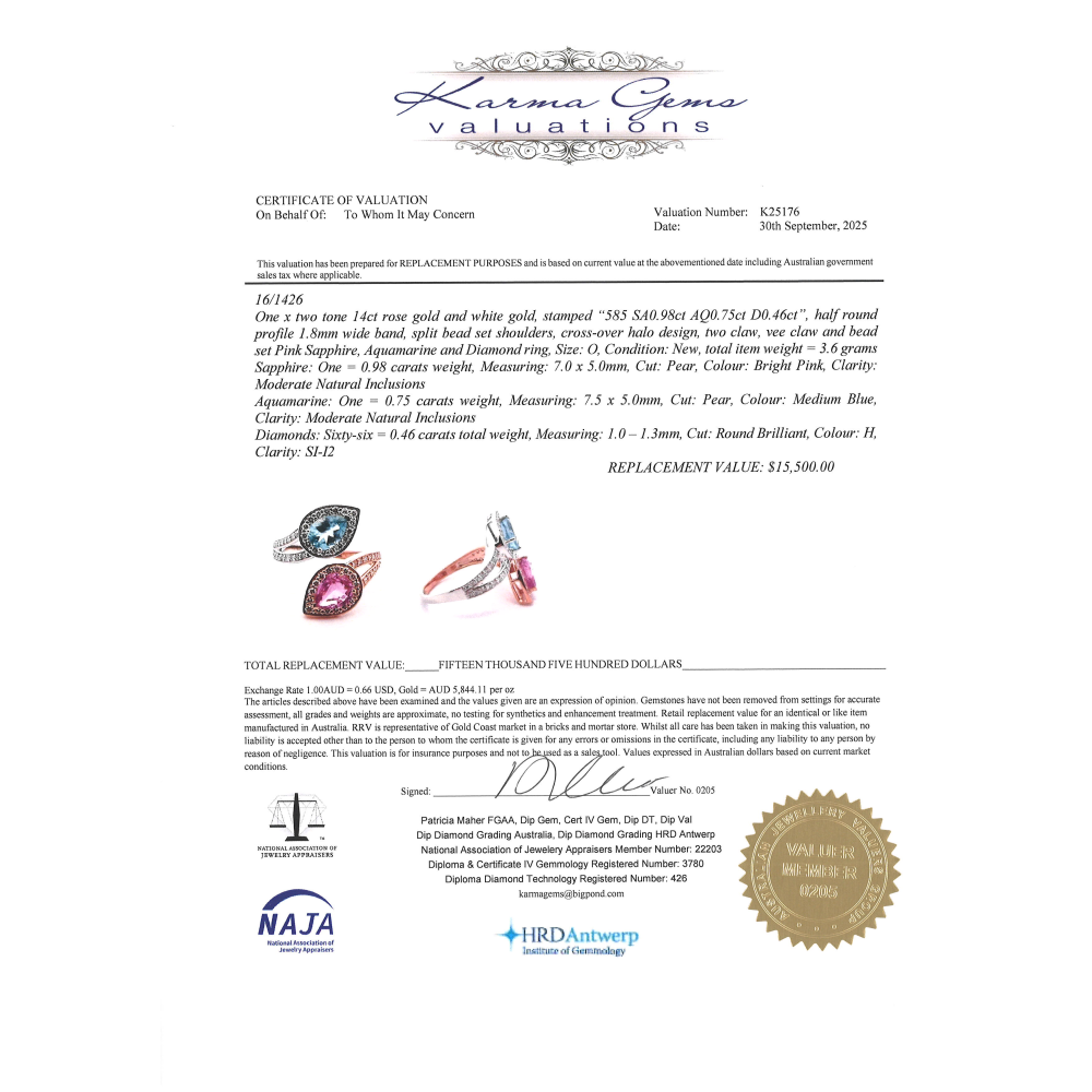 This unique two-stone dress ring pairs the cool clarity of Aquamarine with the vivid warmth of Pink Sapphire, accented by a sparkling diamond frame in a refined two-tone design. The piece features one pear cut medium-blue Aquamarine (0.75ct, moderate natural inclusions) secured in a 3-claw White Gold setting, alongside one pear cut bright pink Sapphire (0.98ct, moderate natural inclusions) set in 3-claw Rose Gold, creating a balanced pastel contrast. Embellishing the asymmetric design are 66 round brilliant cut Diamonds (0.46ct TDW, H colour, SI–I2 clarity) bead set across Rose and White Gold elements, adding brightness and sophisticated flow to the composition.