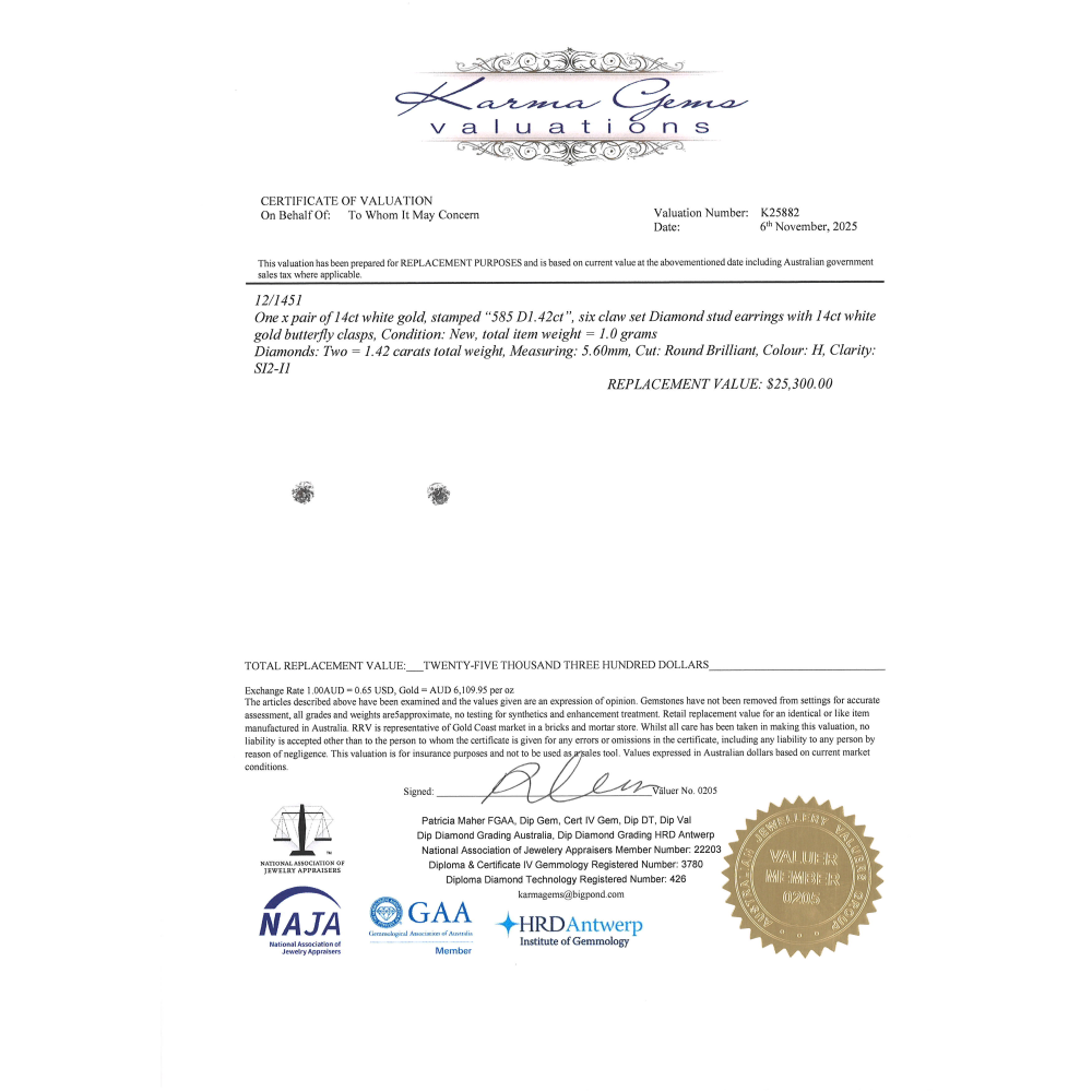 These timeless diamond stud earrings offer exceptional sparkle and universal wearability, crafted in bright White Gold for a clean, modern finish. The design features two round brilliant cut Diamonds with a combined weight of 1.42ct TDW (H colour, SI2–I1 clarity) secured in refined 4-claw settings that maximise light exposure and brilliance. Finished with post backs and butterfly clasps, these studs deliver secure, comfortable everyday luxury.