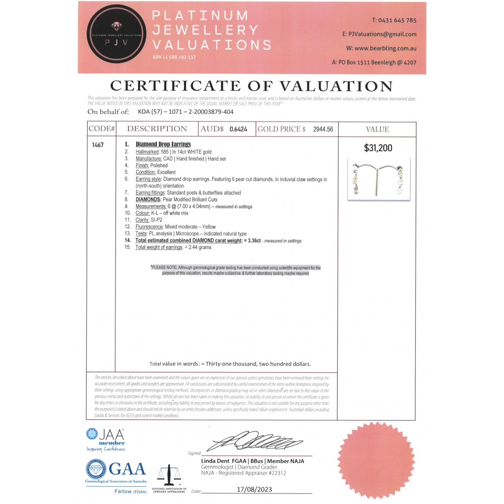 This Insurance Valuation has been provided by a registered Jewellery Valuer and is intended for insurance purposes only. The valuation amount has no bearing on the auction value of the item. Any questions regarding the valuation should be directed to the issuing Valuer (refer to contact details on the certificate) as Luxe Auctions have no association or relationship with the Valuer, or the valuation amount contained within the valuation.