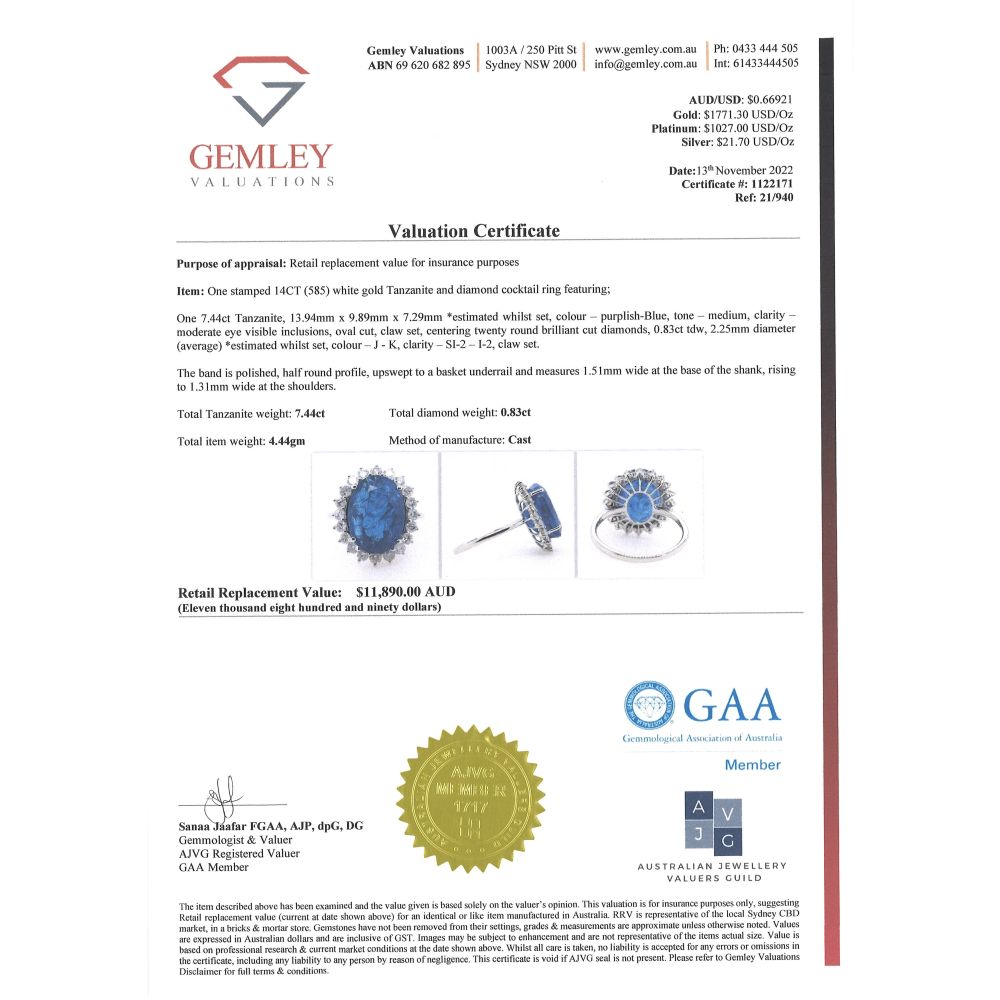This Insurance Valuation has been provided by a registered Jewellery Valuer and is intended for insurance purposes only. The valuation amount has no bearing on the auction value of the item. Any questions regarding the valuation should be directed to the issuing Valuer (refer to contact details on the certificate) as Luxe Auctions have no association or relationship with the Valuer, or the valuation amount contained within the valuation.
