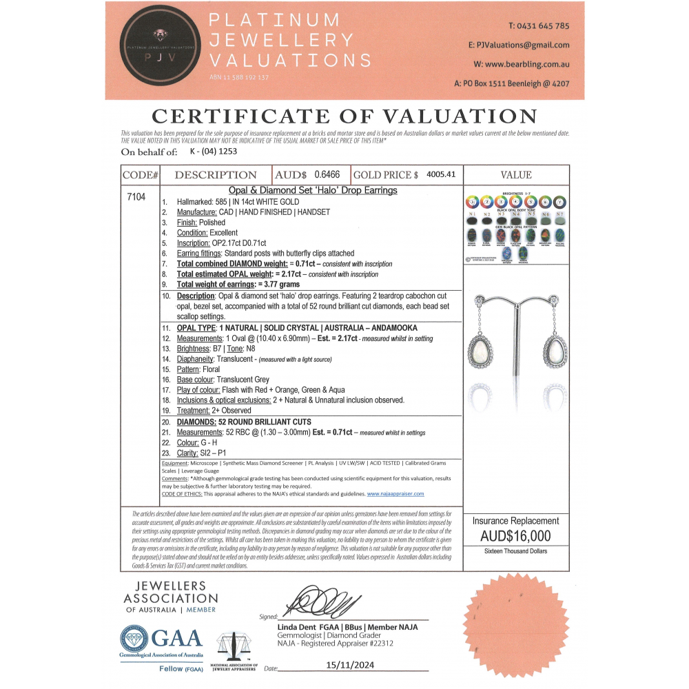 White Gold Andamooka Opal & Diamond Halo Drop Earrings