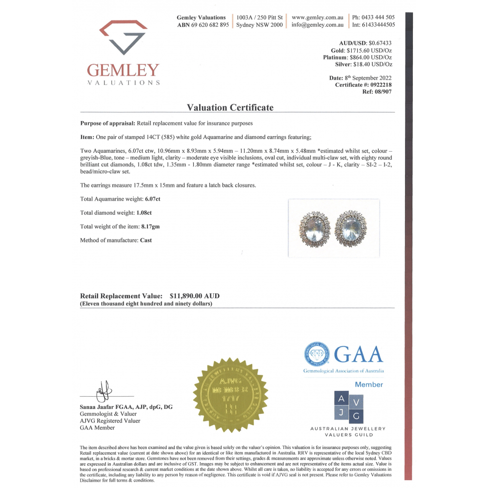 These antique-inspired drop earrings showcase beautifully coloured Aquamarines framed by intricately set diamonds for a refined, heirloom-quality aesthetic. The centres feature two oval cut greyish-blue Aquamarines (6.07ct TSW, moderate eye-visible inclusions) secured in individual multi-claw settings, allowing each stone’s soft blue depth to shine with vintage charm. Surrounding the centres in radiant halos are 80 round brilliant cut Diamonds (1.08ct TDW, J–K colour, SI2–I2 clarity) arranged in a combination of bead and micro-claw settings for a bright, cohesive sparkle. The earrings are completed with elegant latch-back closures for secure and comfortable wear.