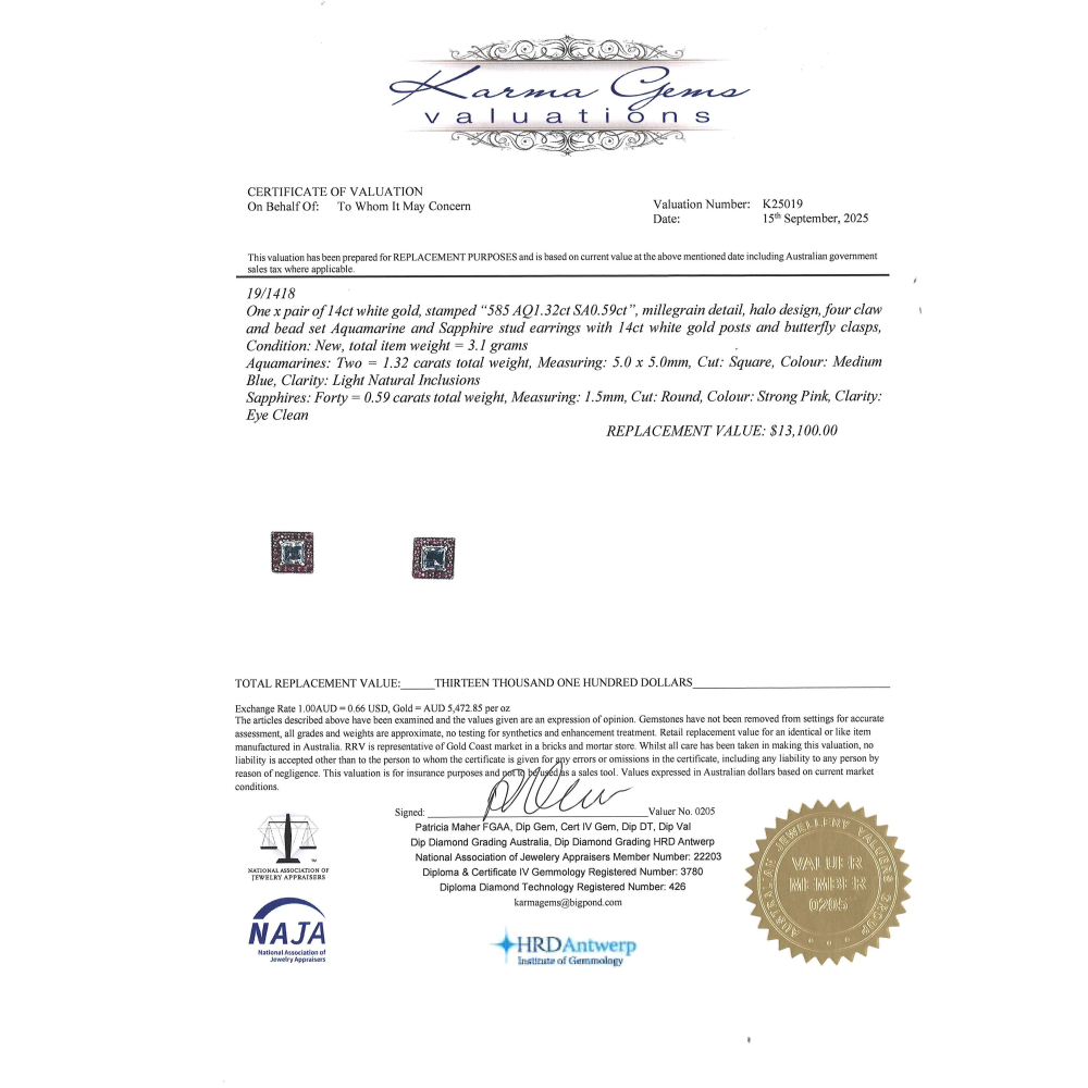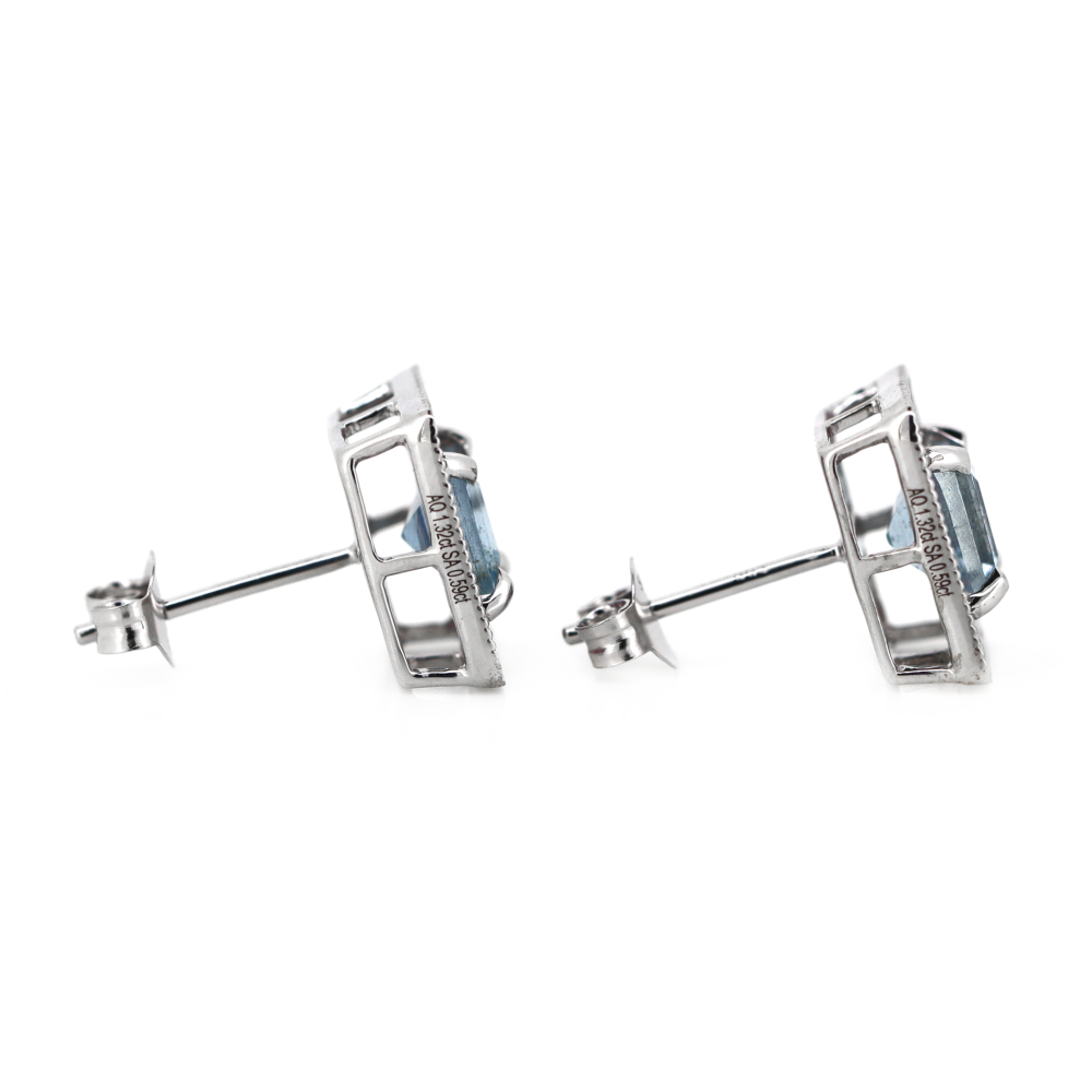 These elegant halo stud earrings pair cool-toned Aquamarines with vivid pink Sapphires for a striking contrast and refined feminine appeal. The centres feature two square cut medium-blue Aquamarines (1.32ct TSW, light natural inclusions) secured in classic 4-claw settings, showcasing their crisp colour and symmetry. Surrounding the centres in radiant halos are 40 round cut strong pink Sapphires (0.59ct TSW, eye-clean clarity) bead set to deliver vibrant colour saturation and a lively pop against the cool blue centres. The earrings are completed with post backs and 14K White Gold butterfly clasps for secure comfort.