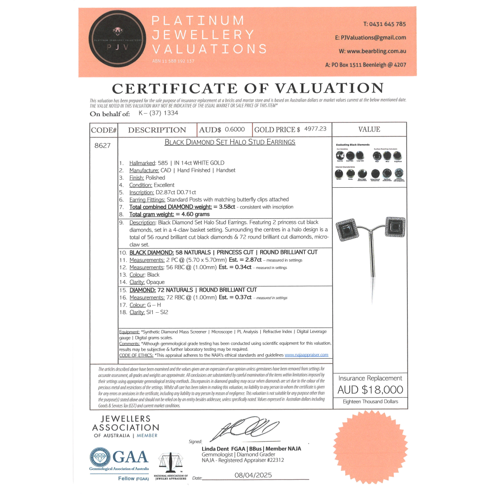 The centre features 2 princess cut Black Diamonds (2.87ct TDW, opaque), 4 claw set to command attention with bold depth and allure. Encompassing the centre in the inner halo are 58 round brilliant cut Black Diamonds (0.34ct TDW, opaque), micro-claw set for a seamless tonal contrast. Decorating the outermost halo are 72 round brilliant cut Diamonds (0.37ct TDW, G–H colour, SI1–SI2 clarity), micro-claw set to enhance brilliance and definition.