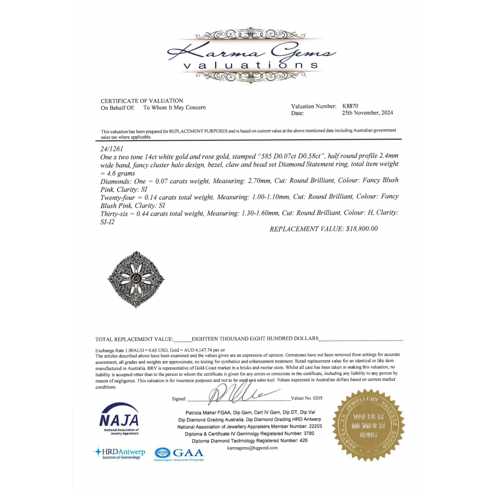 This Insurance Valuation has been provided by a registered Jewellery Valuer and is intended for insurance purposes only. The valuation amount has no bearing on the auction value of the item. Any questions regarding the valuation should be directed to the issuing Valuer (refer to contact details on the certificate) as Luxe Auctions have no association or relationship with the Valuer, or the valuation amount contained within the valuation.
