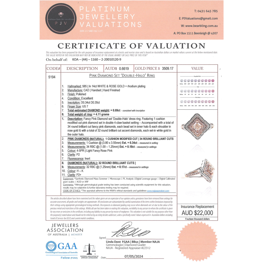 Pink Diamonds (Centre): Cushion cut + 34 round brilliant cuts (0.52ct TDW, light fancy rose pink, P2 clarity), claw/bead set in Rose Gold