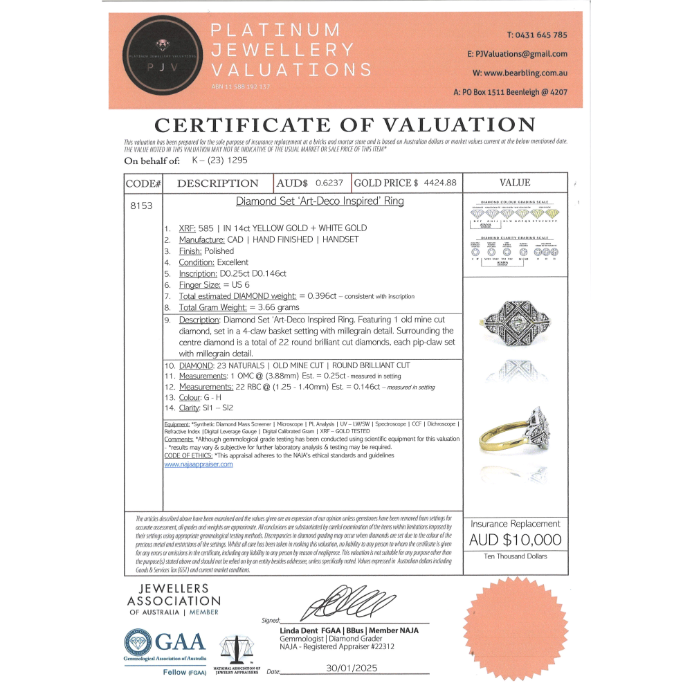 This elegant Art Deco inspired ring highlights a 0.25ct old mine cut Diamond (G–H colour, SI1–SI2 clarity), claw set with intricate millegrain detail. Surrounding the centre are 22 round brilliant cut Diamonds (0.146ct TDW, G–H colour, SI1–SI2 clarity), pip set with fine millegrain craftsmanship for a timeless vintage appeal.
