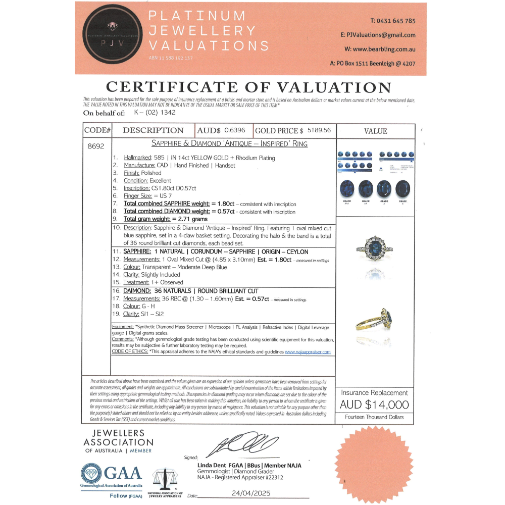 The centre of this elegant design showcases a 1.80ct oval cut Ceylon Sapphire (moderate deep blue, slightly included, enhanced), claw set to highlight its vivid depth of colour. Decorating both the halo and the band are 36 round brilliant cut Diamonds (0.57ct TDW, G–H colour, SI1–SI2 clarity), bead set to enhance the sapphire with radiant sparkle.