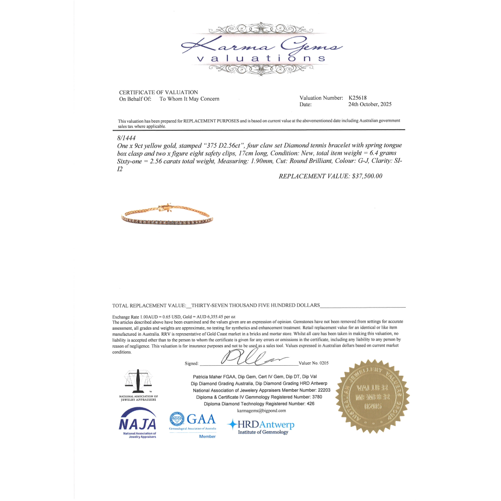 This Insurance Valuation has been provided by a registered Jewellery Valuer and is intended for insurance purposes only. The valuation amount has no bearing on the auction value of the item. Any questions regarding the valuation should be directed to the issuing Valuer (refer to contact details on the certificate) as Luxe Auctions have no association or relationship with the Valuer, or the valuation amount contained within the valuation.