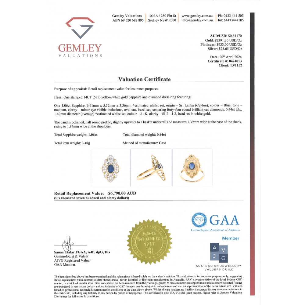 This antique-style statement ring highlights the unmistakable glow of a natural Blue Ceylon Sapphire framed by a radiant surround of diamonds. The centre features one oval cut medium-blue Ceylon Sapphire (1.06ct, minor eye-visible inclusions) bezel set to emphasise its rich Sri Lankan hue and classic vintage silhouette. Decorating the setting are 44 round brilliant cut Diamonds (0.44ct TDW, J–K colour, SI2–I2 clarity) arranged in a refined bead-set pattern to create soft, continuous sparkle around the Sapphire.