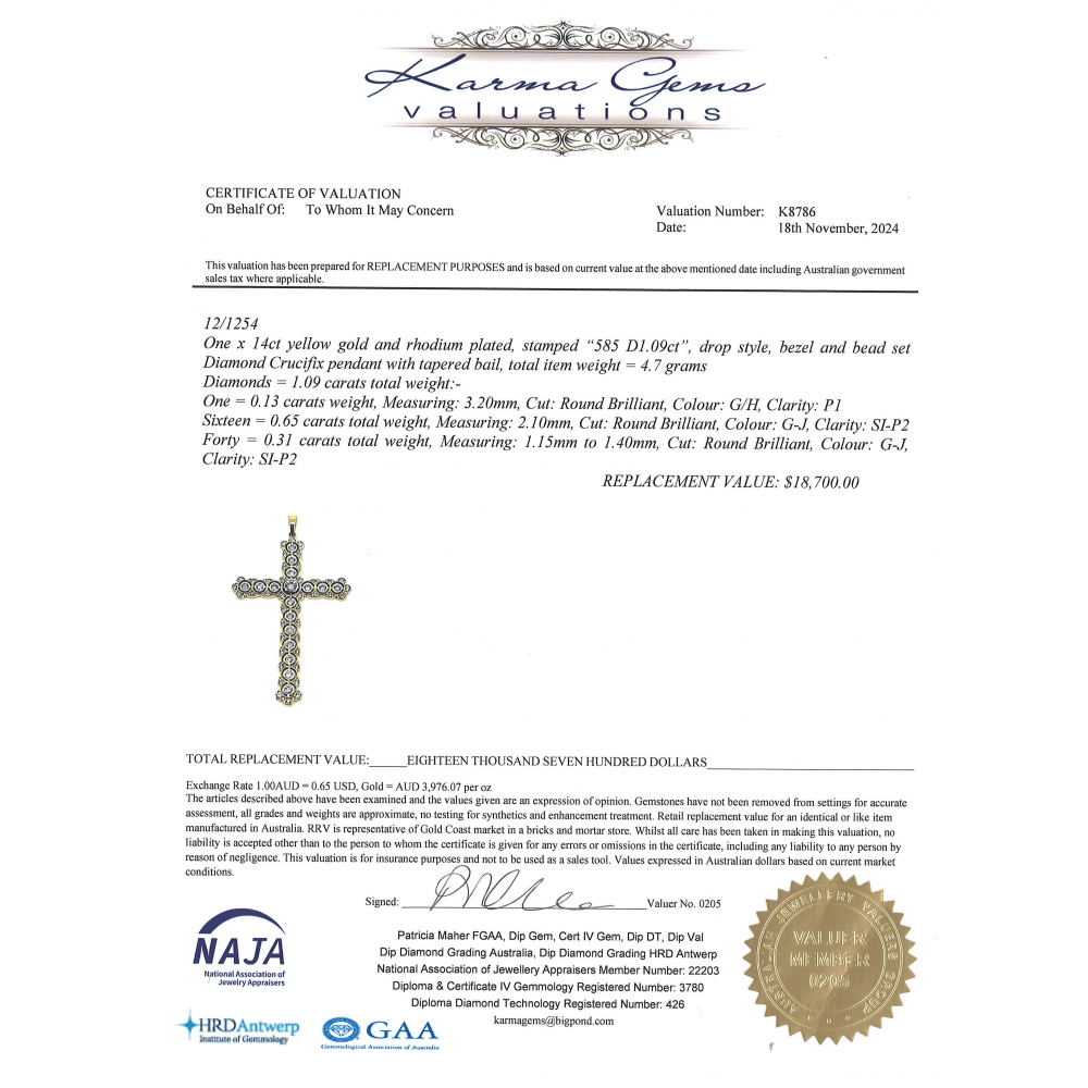 This finely crafted crucifix pendant showcases a harmonious arrangement of diamonds set in rich Yellow Gold, delivering both spiritual symbolism and elevated jewellery artistry. The centre features one round brilliant cut Diamond (0.13ct, G–H colour, P1 clarity) bezel set as the focal point. Enhancing the cross structure are 16 round brilliant cut Diamonds (0.65ct TDW, G–J colour, SI–P2 clarity) in a combination of bezel and bead settings, adding depth and luminosity. Completing the border is an additional 40 round brilliant cut Diamonds (0.31ct TDW, G–J colour, SI–P2 clarity) bead set to create a refined, fully framed silhouette.