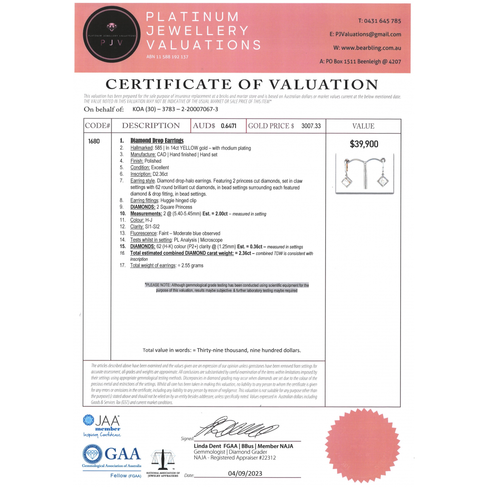 These sophisticated drop earrings showcase bold geometric styling paired with exceptional diamond presence. The centres feature two square princess cut Diamonds (2.00ct TDW, H–J colour, SI1–SI2 clarity) claw set, delivering sharp light performance and strong architectural appeal. Surrounding each centre stone in a square halo—and extending along the earring hooks—are 62 round brilliant cut Diamonds (0.36ct TDW, H–K colour, P2+ clarity) bead set for added sparkle and refined detailing. The earrings are completed with secure lever-back closures, ensuring comfortable and confident wear.