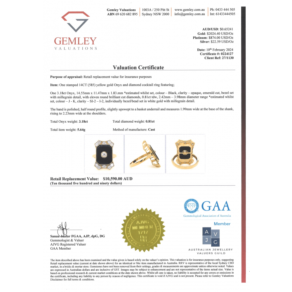 The design features one emerald cut black Onyx (3.18ct, opaque), bezel set with millegrain detail for an authentic Art Deco aesthetic. Centering and bordering the Onyx are 11 round brilliant cut Diamonds (0.81ct TDW, J-K colour, SI2-I2 clarity), bezel/bead set in White Gold with millegrain detail, creating a striking contrast between light and dark tones.