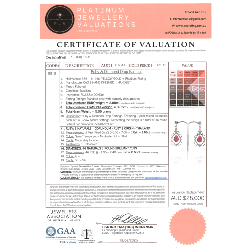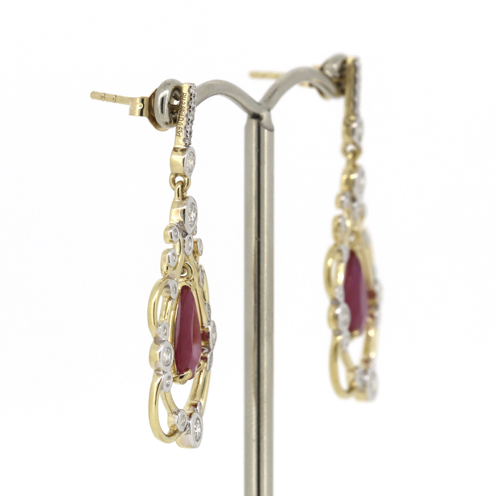 These refined drop earrings pair vibrant Rubies with shimmering diamonds, enhanced by contrasting Rhodium-plated detailing for a modern yet timeless aesthetic. The design features two pear cut moderate pinkish-red Rubies (2.88ct TSW, moderately included, enhanced) secured in elegant 3-claw Yellow Gold settings that highlight their rich colour. Embellishing the drops are 46 round brilliant cut Diamonds (0.63ct TDW, G–H colour, SI1–SI2 clarity) micro-bead and bezel set with Rhodium plating, amplifying the brightness and crispness of the overall design. The earrings are fitted with post backs and butterfly clasps for secure and comfortable wear.