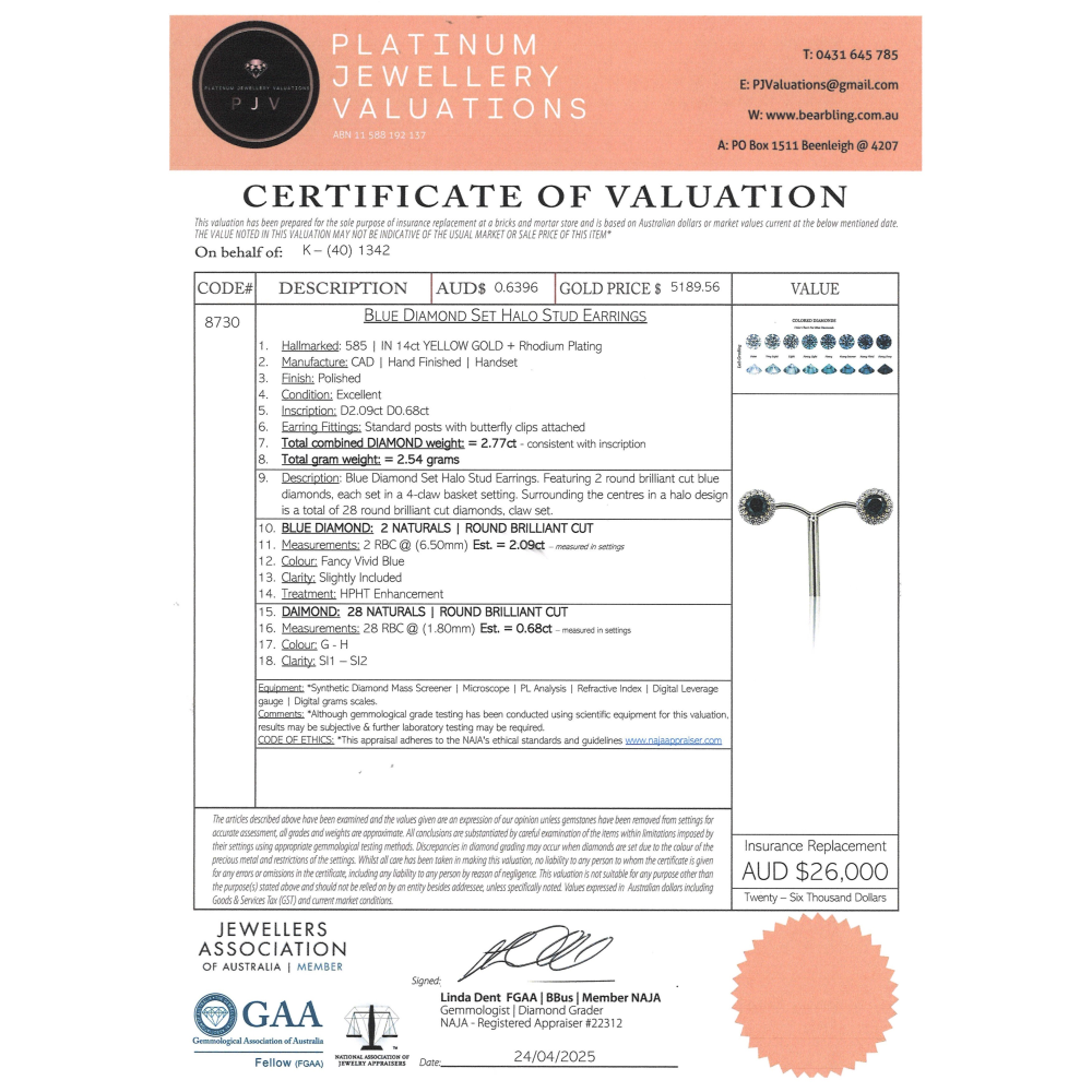 These striking halo stud earrings feature rare vivid blue Diamonds enhanced through HPHT treatment, delivering exceptional colour saturation and dramatic visual impact. The centres showcase two round brilliant cut vivid fancy blue Diamonds (2.09ct TDW, slightly included, HPHT enhanced) secured in multi-claw Yellow Gold settings, amplifying their intense hue and dynamic sparkle. Surrounding the centres in radiant halos are 28 round brilliant cut Diamonds (0.68ct TDW, G–H colour, SI1–SI2 clarity) arranged in shared-bead settings with bright Rhodium plating, creating crisp contrast and elevated brilliance. The earrings are finished with post backs and 14K Yellow Gold butterfly clasps.