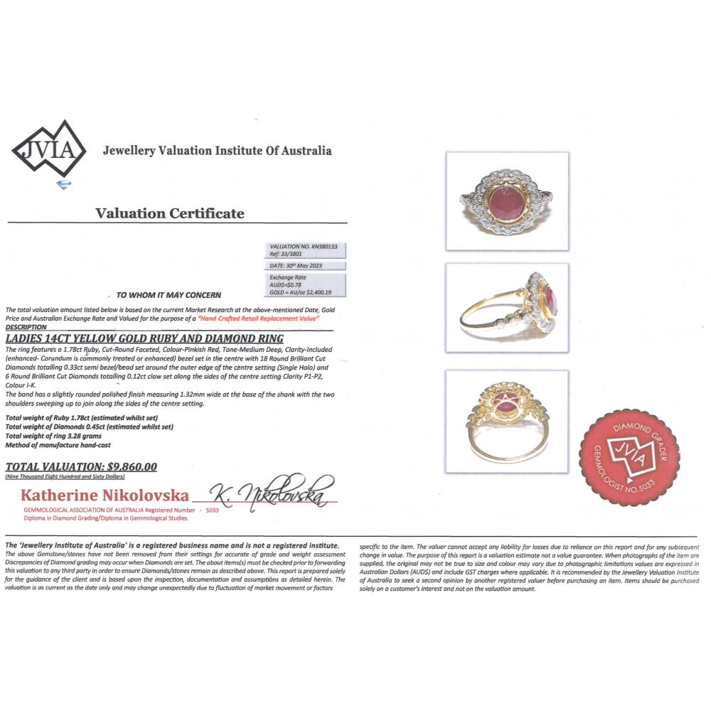 The centre features one round faceted cut medium deep pinkish-red Ruby (1.78ct, included, enhanced), bezel set for a rich vintage appeal. Surrounding the centre in a halo and decorating the band are 24 round brilliant cut Diamonds (0.45ct TDW, I-K colour, P1-P2 clarity), claw set for elegant sparkle.