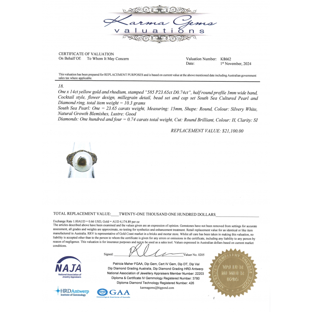 The centre features one round circle white-silver Cultured South Sea Pearl (23.65ct TSW / 15.00–15.50mm size, Grade AA lustre, natural growth blemishes), cap set to highlight its luminous sheen and organic beauty. Decorating the setting are 104 round brilliant cut Diamonds (0.74ct TDW, H colour, SI clarity), meticulously bead set with millegrain detail for a refined vintage touch.